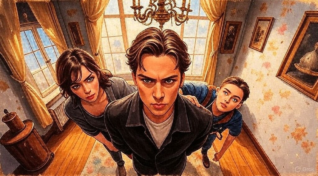 В комнате, где время остановилось, трое молодых лиц устремлены вперёд. Они словно герои из старинного романа, тщетно пытающиеся разглядеть тех, кто находится за страницами их уютного мира. Яркий свет, проникающий через плотно задернутые шторы, словно сцена, обрамляет их силуэты. Тени, легкими штрихами падающие на пол, придают пространству мистическую глубину и многослойность. Центральный герой, с волнующей загадкой в глазах, смотрит на нас, требуя разъяснений от этого мира, укутанного в тёмный бархат сурового прошлого. Его спутники, подобно бравым солдатам, следуют за ним, подчеркивая нерушимость их общей цели. Один из них поворачивает лицо влево, будто намереваясь услышать призрачные мелодии прошлого, которые бродят в этой комнате. Память кажется утяжеленной, но в ней всегда есть место для неожиданной искры надежды. Пространство наполняется шёпотом финала давно потерянного разговора, светом, что мерцает и гаснет под звуки безымянной симфонии, которую они играют для нас, зрителей по ту сторону непреклонного стекла.