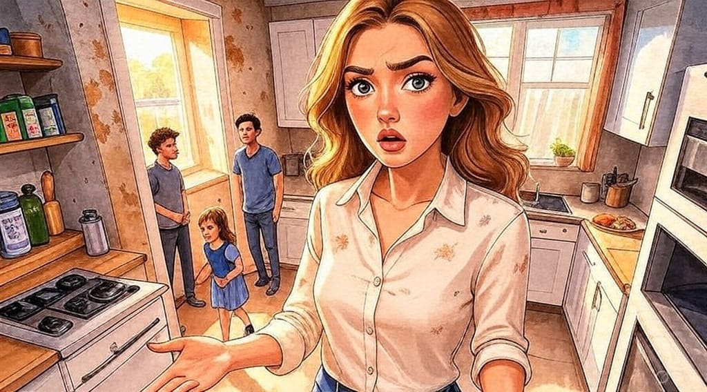 Свет утреннего солнца льётся из окна, наполняя кухню теплою иллюзией уюта. Но в центре событий разыгрывается драма — женщина с широко распахнутыми глазами и поднятой рукой вопрошает пустоту или, может, свою семью, стоящую на заднем плане. Мужчина и двое детей — они наблюдают за ней с нерешительностью, словно персонажи пьесы, которым ещё не выдали роль. На переднем плане — хаос повседневности, разбросанные предметы кухни как немые свидетели невидимого абсурда. Дети задаются вопросами, которые взрослые давно забыли. Они стоят, как маленькие статуи из будущего, где ответы только начали формироваться, обрамлённые светом, как забытыми отпечатками на стираних листьях. Эта сцена — зеркало, в которое смотрится каждая семья, пытаясь поймать смысл момента. Задумчивые тени и тёплая энергия утра сливаются воедино в этом мгновении ожидания и непонимания.