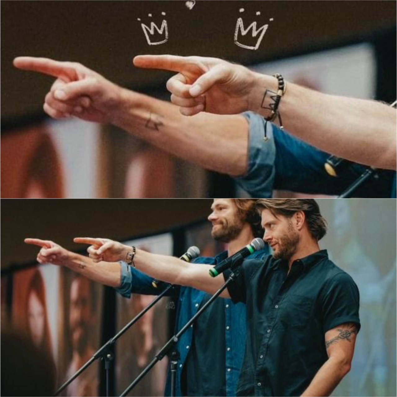 Руку, как крылья свободы, вытянули два героя, показавшие в своей совместной харизме всю силу единства. Из-под рукавов рубашек выглядывают татуировки, как символы неслучайных мимолётных воспоминаний. В движении, в простом кивающе указующем жесте, отражается энергия сцены, где каждый вдох и выдох зрителей сливается в единый ритм. Их взгляды продольно сверкают под светом прожекторов, гармонично падающим на лица. Голоса, усиленные микрофонами, становятся эквивалентом доверия между ними и аудиторией. Короны над руками на мгновение превращают их в королей момента, правящих своими словами и жестами, запечатлённые в контексте времени и места, являющегося коллективной памятью всех присутствующих.