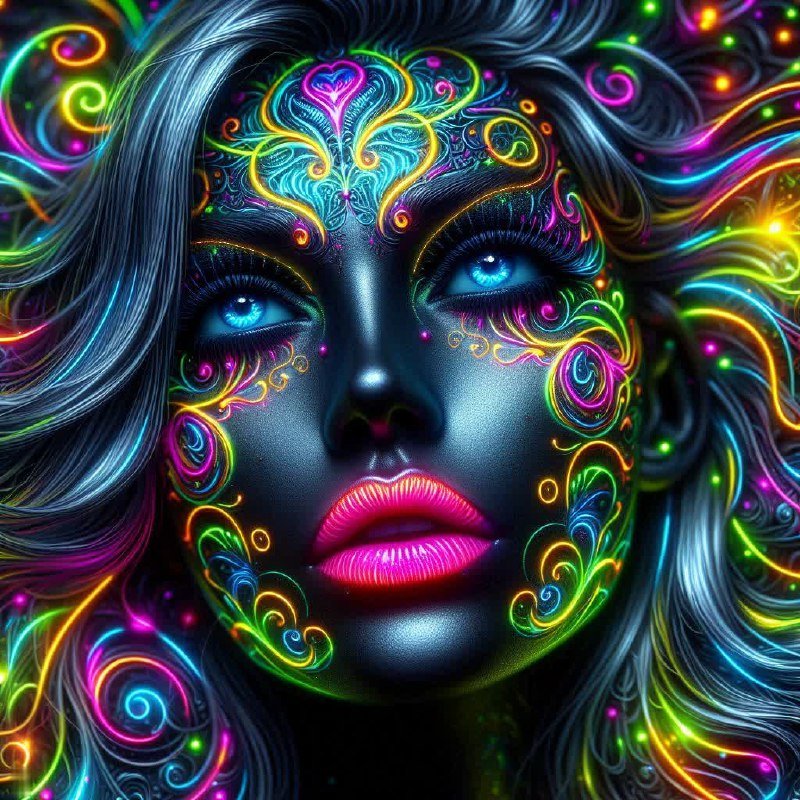 В потоке тихой ночи появляется лика сказочного существа, её кожа словно чёрное полотно, на котором свет очарования плетёт неоновые узоры. Лица таинственны и притягательны, как светящиеся витражи соборов. Глубокие лазурные глаза, омуты тайн, переполненные магнетизмом звёздного света, блестят будто волны туманного океана. Арт-фантазия пульсирует волшебством, превращая мечты в световые нити, бегущие по космической дороге вечности. Розовые губы, целующие ночь, оставляют за собой след из невинных шёпотов и тайн. Это лицо – портал в мир вечного сияния, где каждый узор – невидимая нить судьбы, вплетённая в ткань времени. Что, если все скрытые чувства обрели себе дом в этих ярких свершениях? Мир растворяется в цветах призм, оставляя в сознании отпечаток незабытого видения.