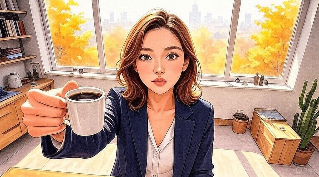 В этом тихом утреннем миге, когда город только начинает просыпаться, девушка протягивает чашку кофе словно приглашение к разговору — зернистое, горькое и удивительно настоящее. За окном улица, окутанная золотыми листьями осени и вуалью утреннего тумана, растворяется в силуэтах здания мегаполиса. Тёплый свет проникает в комнату, обнимая книги на полке и зелень кактуса, вспыхивая в её глазах загадочной искоркой. Она — воплощение спокойствия и уверенности, где её взгляд словно читает невидимые строки жизни, записанные на горизонте, и здесь, в этом пространстве, всё кажется возможным. Голос за кадром шепчет: "Вдохновение приходит с утра, как тихая симфония", — и в эти моменты её рука с чашкой — мост между реальностью и мечтой, связующий нити дневной суеты и вечной гармонии.