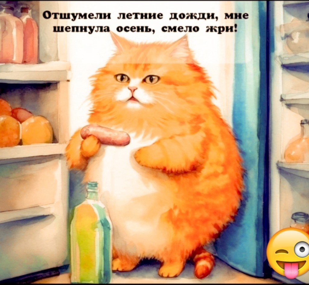Запах осени врывался в кухню, словно ностальгия о солнечных летних днях, оставляя после себя холодные капли на окнах. И вот он — рыжий философ, царь холодильника, с чуть насмешливым взглядом, ставится перед открытыми дверцами. Ему чужды людские тревоги и суетные хлопоты. Он одинокий рыцарь в своем закате золотого меха, держащий символ своего триумфа — колбасу. "Отшумели летние дожди, — шептала ему осень нежно, — смело жри!" Кажется, для него не существует понятия времени. Оказалось, что ночь и день слились в один момент покоя, где нет нагрузки повседневности. Он, как герой старой сказки, нашел свой грааль, осененный мерцающим светом лампы, создавшей уютный, почти сказочный мир. Этот образ — маленький сюжет жизни, наполненный спокойствием и уверенностью в завтрашнем дне.