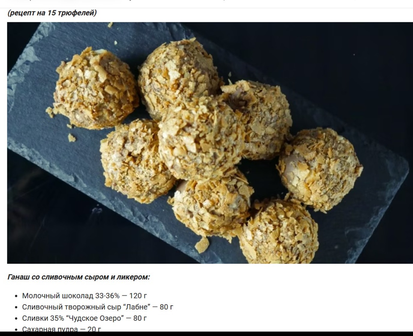 Вмешивается голос из-за кадра, едва слышный шёпот напоминает, что рецепт пригоден для пятнадцати. Как послание из другого мира, инструкция раскрывает секреты кулинарной алхимии: молочный шоколад, сливочный сыр "Лабнэ", сливки с безмятежными водами чудного озера, а затем — сахарная пудра, словно пух снежных облаков, что тают на солнце. Это волшебство — трюфели на чёрной мраморной плите — создаёт иллюзию спокойствия и обволакивающей теплоты.