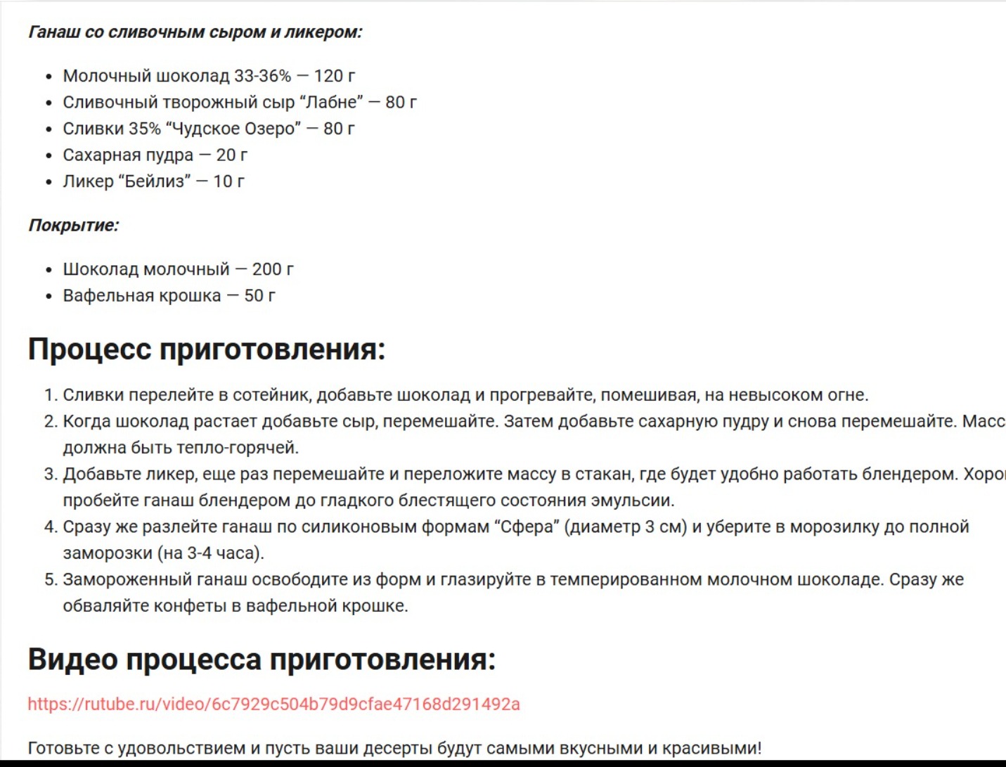 На мягких страницах, словно рассыпанные аппетитные звуки, раскрывается рецепт – симфония сладкой алхимии и кулинарного искусства. Шелковистый ганаш с ликёром обрамляет нежную текстуру сливочного сыра, мост через который — молочный шоколад и кремовые облака сливок "Чудское Озеро". Как заклинание, прячутся в уголке рецепта слова: "Готовьте с удовольствием и пусть ваши десерты будут самыми вкусными и красивыми!" — словно шёпот доброй феи, дарующий праздничное волшебство. Каждая деталь этого рецепта, как ноты на партитуре, танцует в гармонии кулинарной радости. Молочный шоколад и вафельная крошка замыкают круг наслаждения, где сладкий мир ожидает своих создателей. На страницах есть и упоминание видео — таинственный проводник, позволяющий окунуться в тайны кулинарного искусства, где каждое действие исполнено глубокого смысла и непередаваемой красоты.