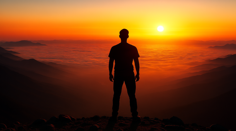 На краю света стоит человек, словно герой древних мифов, готовый принять свой путь под пылающим диском заката. Горы сплетаются в дымчатую волну, растекающуюся у его ног, как море снов и надежд. Солнце, как золотая медаль, венчает небосклон, озаряя его лицо светом, который может быть и грозовым рассветом. В этом погружении в багряный свет заключен момент истины — здесь и сейчас, где прошлое обнимается с будущим, оставляя лишь оттенок глубокого покоя. Надпись у его ног, будто древняя печать, фиксирует этот миг вечности, что выворачивает сознание вовне и внутрь, в ожидании нового дня.