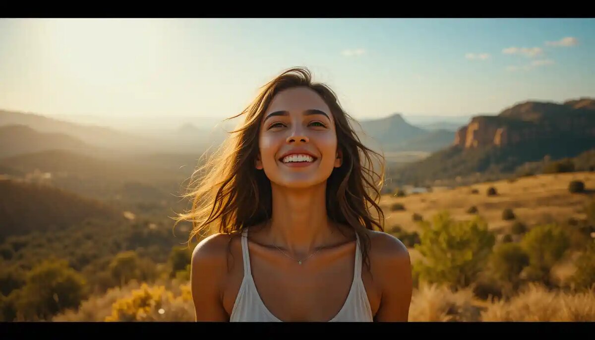 На золотистой холмистой равнине раскинулась картина величавой естественности. Девушка, словно воплощение утреннего солнца, улыбается, как будто приветствуя новый день. Ветер нежно играет с её волосами, мерцающими в свете, как потоки янтарного света. Виднеются далёкие горы, окутанные голубоватой дымкой. Эта сцена пронизана духом свободы, бескрайности и тихого счастья. Чувствуется шёпот времени, разговоры о вечных переменах, о земной и небесной гармонии. Закат за спиной привносит нотки меланхоличного вдохновения, как в поэзии Заболоцкого, где природа и человек сливаются в одном ритме. Кажется, этот миг может длиться вечно, оставляя после себя сладкое послевкусие непостижимого мира.