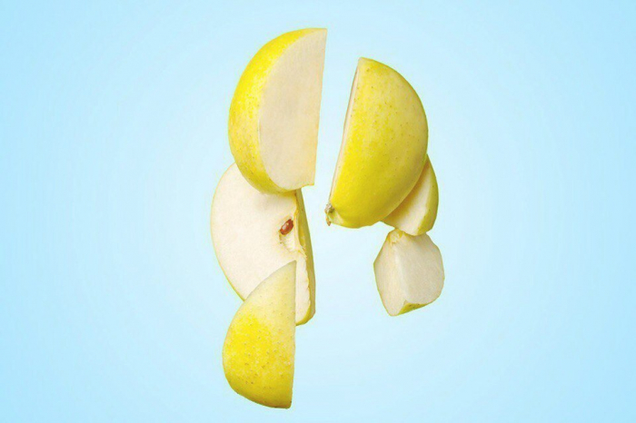 На небесно-синем фоне парит яблоко, словно рассыпаясь в замедленном движении на несколько идеальных сегментов. Желтое, сияющее как маленькое солнце, оно делится на части, подобно тайне, расколотой на осколки. Каждая доля вбирает в себя блики света и отблески прошлого лета на яблоневых ветвях. Это яблоко, как символ жизни — простое и сложное одновременно, вызывает воспоминания о потерянной невинности или же обещании обновления. Словно кадр из мечты или иллюзии, оно в себе вобрало сразу несколько смыслов: от идеальной симметрии природы до проявления скрытых значений в каждом изъянчике кожицы. Слово, шёпотом сказанное за рамкой, намекает на перспективу — в неразрывности видимого и написанного, как в единстве времени и вечности, ковчег надежды защищает этот фрукт от забвения.