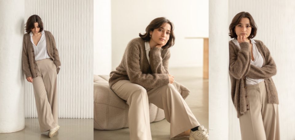 В этом камерном пространстве света и текстуры, где каждый элемент кажется продуманным до мелочей, трехчастная сцена женщины словно происходит в трех актах тихой драмы. Она, одетая в мягкие землистые тона, несет на себе благородную простоту, как героиня из романа о поиске внутренней гармонии. Её свободный кардиган и брюки, небрежно спущенные на мягкие туфли, создают ощущение тепла и уюта, как будто она окружена пледом в холодный день. Стены белого цвета окружают её покой, ставя в центр внимания естественность характера. Невесомый свет подчеркивает черты её задумчивого лица: мягкие тени играют на щеках, добавляя глубину взгляду. То, как она опирается о белую колонну или сидит на большом пуфе, словно задает тональность всему пространству. Посторонние голоса издалека заглушаются мягким шепотом её мыслей, соединяясь в единую симфонию у времени. Пространство вокруг кажется храмом этого концентрационного момента покоя и непринужденности.