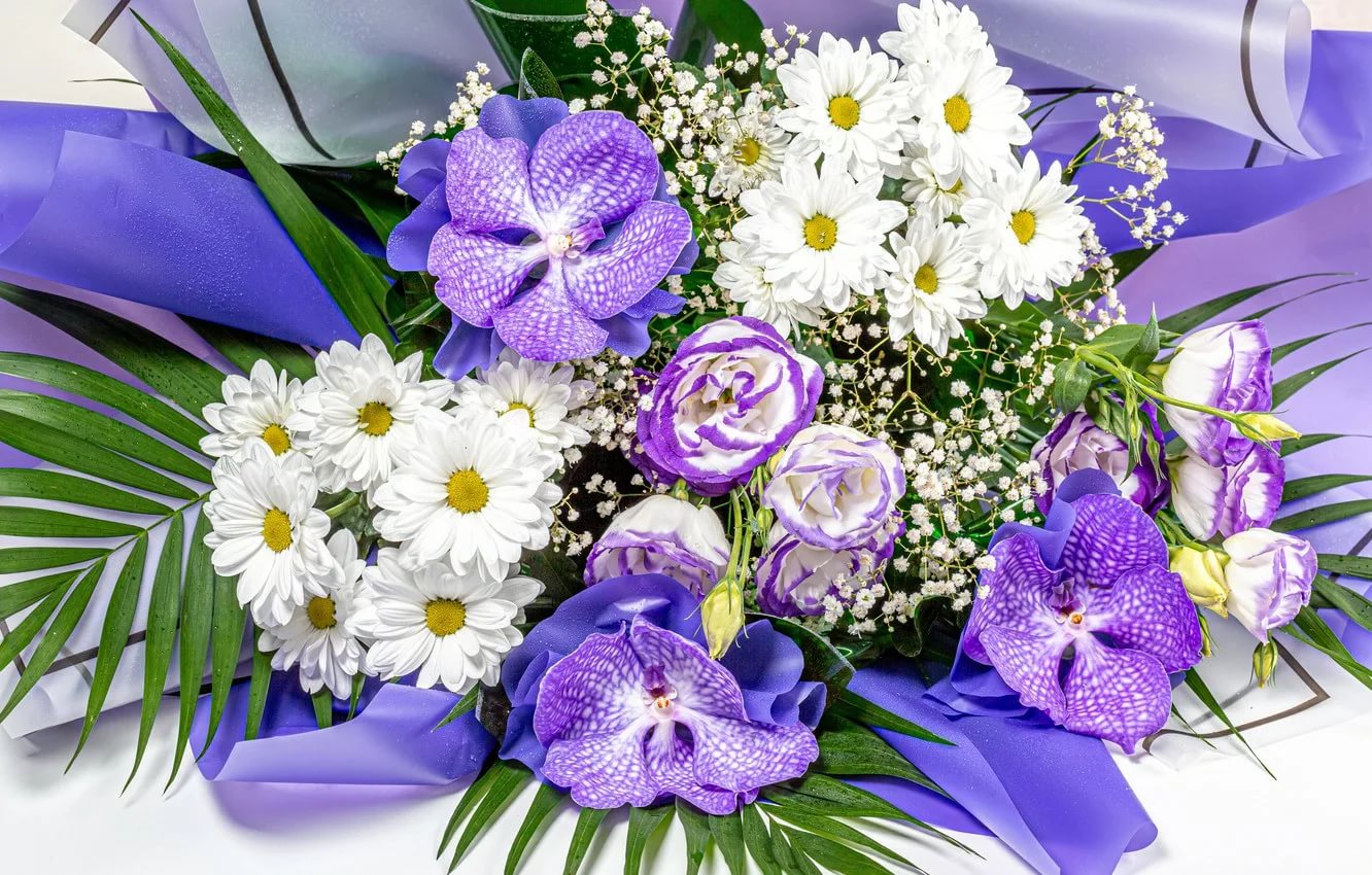 Букет, как произведение искусства природы, раскинулся на столе в элегантной симфонии красок. Белоснежные ромашки, словно наивные пастушки, обрамляют пурпурные орхидеи – этих королев ночи, прихотливо разложившие свои лепестки, напоминая о тропических снах. Среди зелени пальмовых листьев заря плещет свежестью, как ранний утренний воздух, почти осязаемый, колышущийся вокруг. Лаванда – это голос пустынного степного шёпота, пауза, наполненная тысячью невысказанных историй. В каждом цветке – целая вселенная, готовая взорваться ароматами весны и нежными этюдами. Кажется, что легкий ветерок тронет лепестки, и они начнут переливаться в такт незримой, но вполне осязаемой мелодии.