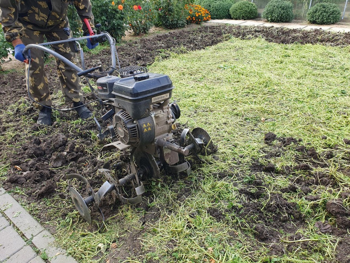 На пёстрое полотно осеннего сада ложится зерно будущего урожая. Сапфировые перчатки, словно руки волшебника, держат под уздцы старый и верный мотоблок, который роет землю, освобождая её от сковывающих пут травы. Это танец машины и человека, который вечер сжимает в ладони, заставляя течь время медленно, как мёд по ложке. Вокруг пикирующие настурции, как часовые, следят за каждым движением, а небо клонится к земле, подрагивая в ритме мотора, превращая тяжёлый труд в симфонию заботы о завтрашнем. Осень, словно художник мексиканского модерна, наносит свои яркие мазки на поля и сады, создавая картину, которая увековечивает смену сезонов. Это хроника земли, заключённая в железные зубья, поющими о будущем хорошем урожае.
