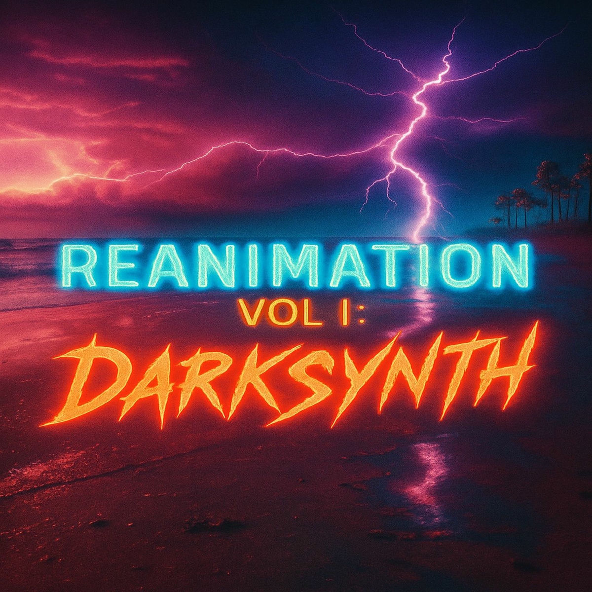В ночной безмолвии, под пурпурным куполом неба, разрываемым молниями, притаился берег. Ласковый шёпот волн, раскаты грома, игра света и тени на воде создают мифическую атмосферу, будто это не просто песчаный пляж, а священная сцена грядущих событий. Неоновый свет слов "REANIMATION", как магическое заклятие, придаёт ощущение начала чего-то неизведанного. Грозовые облака, словно театральные декорации, готовятся к кульминационному акту. "VOL I: DARKSYNTH" — пророчество звукового путешествия, где синтезаторы поют о природе и технологиях. В этой сцене, каждая деталь — это нота в симфонии ночи, обещание чего-то нового, чего-то, что вскоре оживёт.