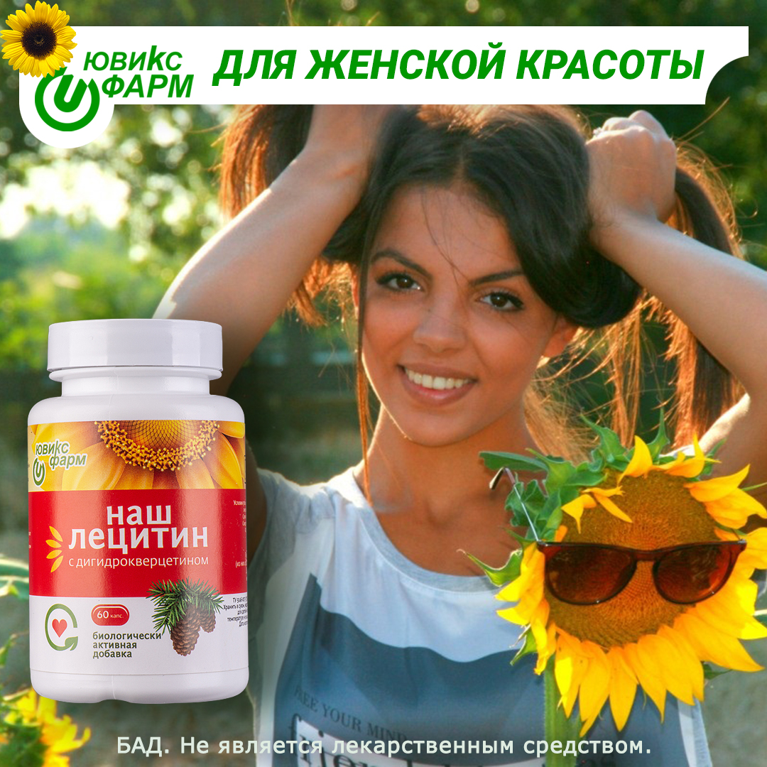 На фоне солнечного лета и мягких шёпотов природы, где золотые поля встречают светлые горизонты, молодая девушка с сияющей улыбкой обрамлена зеленью и радуется моменту. В её глазах отражается лёгкость и полет мысли, как будто вся её сущность говорит о том, что красота — это не только внешность, но и внутренний свет. На переднем плане, как символ естественной красоты и здоровья, расположена банка с надписью "наш лецитин". Ощущение свежести и простоты переплетается с образом подсолнуха, который, словно маленькое солнце, смотрит с надеждой на новый день. Все вокруг шепчутся о силе природы, которую вобрали в себя эти добавки. Этот мир живёт и дышит гармонией, удостоверяясь в том, что истинная красота идёт изнутри. Это не просто реклама, это приглашение к природной гармонии, к диалогу с собственной естественностью. Видение природы и человека, сплетённые в единый танец света и жизни.