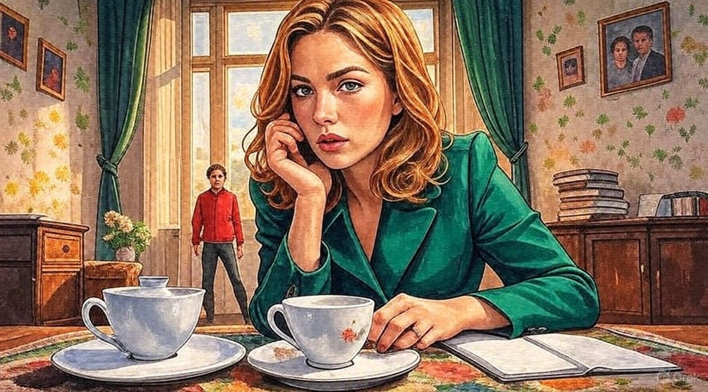 В этом изысканно пронизанном светом и тайной интерьере, женщина в зелёном пиджаке погружена в раздумья, её выразительные глаза устремлены куда-то сквозь чашки с чаем и тишину, словно разрывают ткань реальности. Она воплощает собой бурю в чайной чашке, символ которой расставил свет в тёмных залах прошлого, где жизнь как разбросанные узоры на ковре — пёстра и запутана. Сзади, ребёнок замирает, становясь частью этой театральной сцены, словно воплощая призрак их недосказанности, застывший кадр вечного вопроса. В кадре угадываются отголоски недавнего спора, ожесточённые страсти прошлого текут рекой по стенам, где висят фотографии — немые свидетели этой камерной драмы. Свет, льющийся из окна, рисует на лицах героев тонкие линии их сокровенных мыслей. Мир оживает в зыбком звоне посуды, в сражении светотени, в которое, кажется, можно нырнуть с головой.