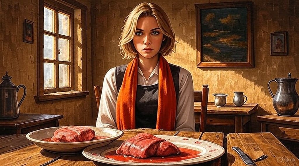 Теплый луч закатного солнца проникает сквозь древние оконные стёкла, погружая комнату в золотистое свечение, словно пригласив на сцену время, потерянное в дальних уголках памяти. Девушка, отражением Монны Лизы, сидит за старинным деревянным столом, как на полотнах Рембрандта, в ожидании ответа на немой вопрос, отражающийся в глубине её глаз. Перед ней блюдо, обрамленное алым сиянием свежего мяса, как будто сцена из какого-то потерянного рассказа о бытии момента, когда всё замерло, соединяясь с миром. Стены обнимают это пространство теней, молча свидетельствуя неспешную беседу солнца и реальности. В этой тишине слышно шёпот истории, привычной ритуальности, смешанной с загадочностью обыденности. Возможно, это кафе Жерома в Бургундии — местечко, где реальность и мечты танцуют пасодобль. Стулья, такие же старинные, как и история этого момента, словно хранят воспоминания о минувших встречах и разговорах. Мельчайшие детали этой сцены оживают своей особенной красотой, каждая трещинка и царапина на мебели отзывается историей. А где-то за кадром, в пространстве виниловых пластинок и запаха кофе, играет вечность.