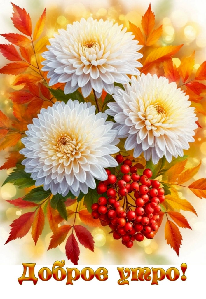 Теплое утро, как мягкое дыхание бабьего лета, окутывает день. Три величественные георгины царствуют на полотне, их лепестки как лучи ратного солнца, пронизанные золотом и мягкими белыми тонами. Они — вестники света, их совершенство замирает в тишине, превращая каждое мгновение в момент медленного пробуждения. В объятиях рябиновых гроздьев, таких ярких, будто художник случайно уронил красный бархат на хрустальную скатерть осени. Листья задорно смехутся в танце пурпурных и золотых оттенков, создавая ослепительные аккорды, отражающиеся в каплях утренней росы. Мир — ещё сонный, тихий и чистый, внезапно оживает в этой гармонии природы. "Доброе утро!" — тихий голос, залетевший в окно с первыми лучами, словно приглашение в новый день. Блики света, подобного пожару изнутри, проникают в самые дальние уголки, и с тёплой надеждой успокаивают тревоги сердца.