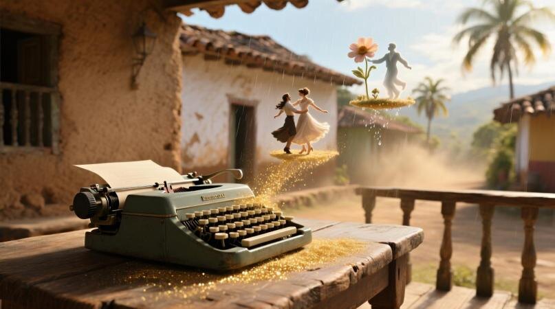 На тёплой деревянной столешнице покоится старинная пишущая машинка, с которой пыль солнечного золота разлетается по придорожной улице. Словно в дивной сказке, над ней парят два силуэта, кружащиеся в танце времён. Их фигуры, будто выложенные из облаков и мечтаний, перекликаются с цветочным орнаментом природы, что как веке украшает украдку вчерашней деревни. Здесь, среди жарких песков и колониальных стен, под серой крышей, жизнь сплетается в затейливые узоры воспоминаний. Перо литератора, заменённое металлическими клавишами, складывает пиктограммы на перевёрнутых страницах мира, переходящего из реальности в фантазию. Голоса сегодняшнего дня вплетаются в вечный шёпот прошлого, а танец двух силуэтов рассказывает безмолвную историю любви и слабости. В этот момент, казавшийся вечным, город живёт своим древним дыханием, и все знаки вокруг складываются в мелодию жизни.