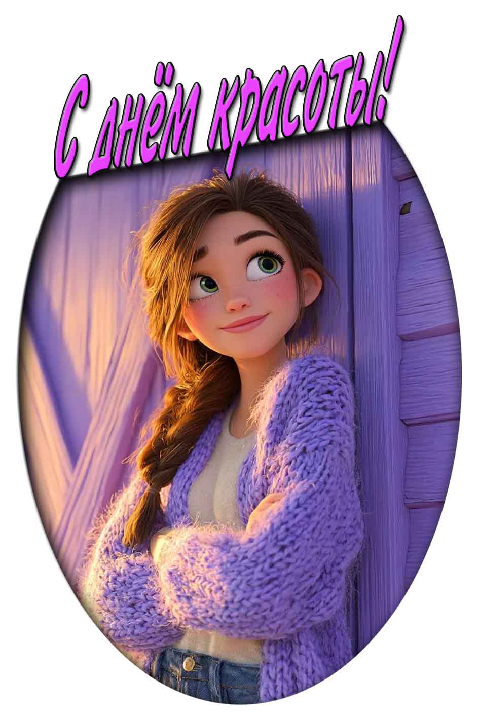 Словно луч солнечного света, она стоит на пороге нового дня, обернутого в мягкий сиреневый кардиган, отражая утреннюю свежесть и энергию в каждом витке своего каштанового локона. Её взгляд, полный нежности и надежды, вопрошает мир, осмелится ли он ответить тем же светом. "С днём красоты!" — слова, висящие в воздухе, как запах цветущей лаванды. Они неотрывны от её сущности, звучат в унисон с тёплыми расцветками деревянной стены позади. Эта сцена — целая вселенная, где каждый элемент — прикосновение к мечте, к новому рождению красоты, которую она несёт своим присутствием. Её улыбка — это мелодия утренней зари, зовущая к новым горизонтам и возможностям. В её глазах отражается мир, наполненный радужными мечтами и гармонией.