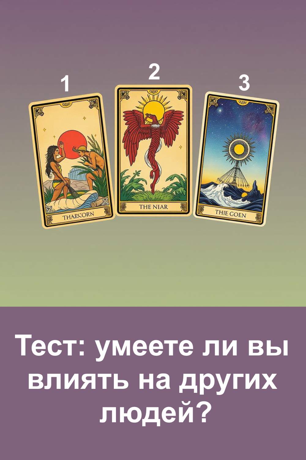 Воображение переносит нас в таинственное пространство, где три карты расстилаются, как три жизненных пути, каждую из которых окутывает мираж тайны и магии. Первая карта, с изображением силуэтов, обрамленных багряным закатом, словно спрашивает о нашем внутреннем огне, о той страсти, что движет нами вперед. Вторая карта, с красно-крылым ниаром, парящим в лучах солнца, напоминает о духовной свободе, о тех моментах, когда мы поднимаем глаза к горизонту. И последняя, с таинственным океаном под ночным небом, взывает к нашей глубинной интуиции, той связи с неизведанным. Все три образа переплетаются, сплетаются в единую мелодию судьбы, а таинственный текст под картами, как шепот сквозь века, обращается к нашей внутренней мудрости: "умеете ли вы влиять на других людей?" Глухой голос времени, стирая грань между человеком и вселенной, между смелостью и неуверенностью, будит в нас желание исследовать собственные границы.