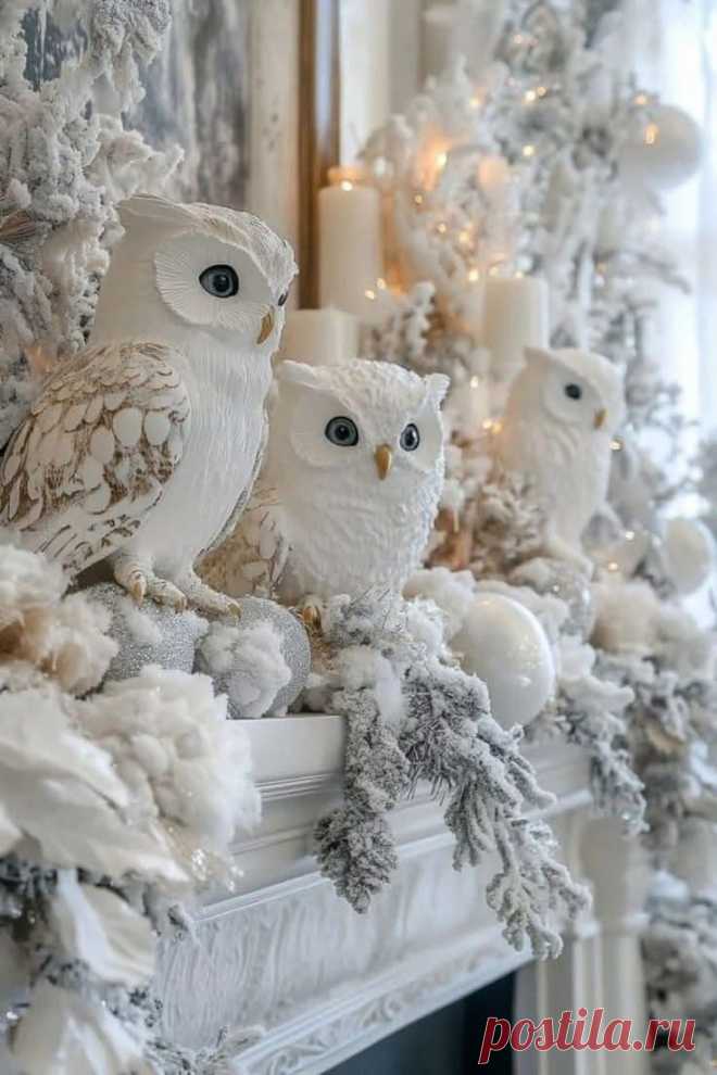В заснеженном царстве уюта и покоя три величественные совы, словно хранители зимней сказки, взирают на мир тихими мудрыми глазами. Их перья, покрытые снежной пылью, как древние манускрипты, раскрывают таинства зимнего леса. Белоснежные ветви обвили камин, превращая его в природный алтарь, где свечи шепчутся тихим светом, словно зимние звёзды, едва пробивающиеся сквозь туман времени. Загадочные контуры смешивают мечты и реальность, как в стихах мистиков. Их фигуры словно принадлежат вечности, обнимая момент волшебства. Совы бесшумно преображают пространство, как хранители спокойствия, их присутствие есть омут безмолвных чудес. Каждая деталь этого кадра — это шаг вглубь гармонии и простоты, где вечное снежное покрывало укутывает каждый уголок в таинственную теплую шелкову тишину.