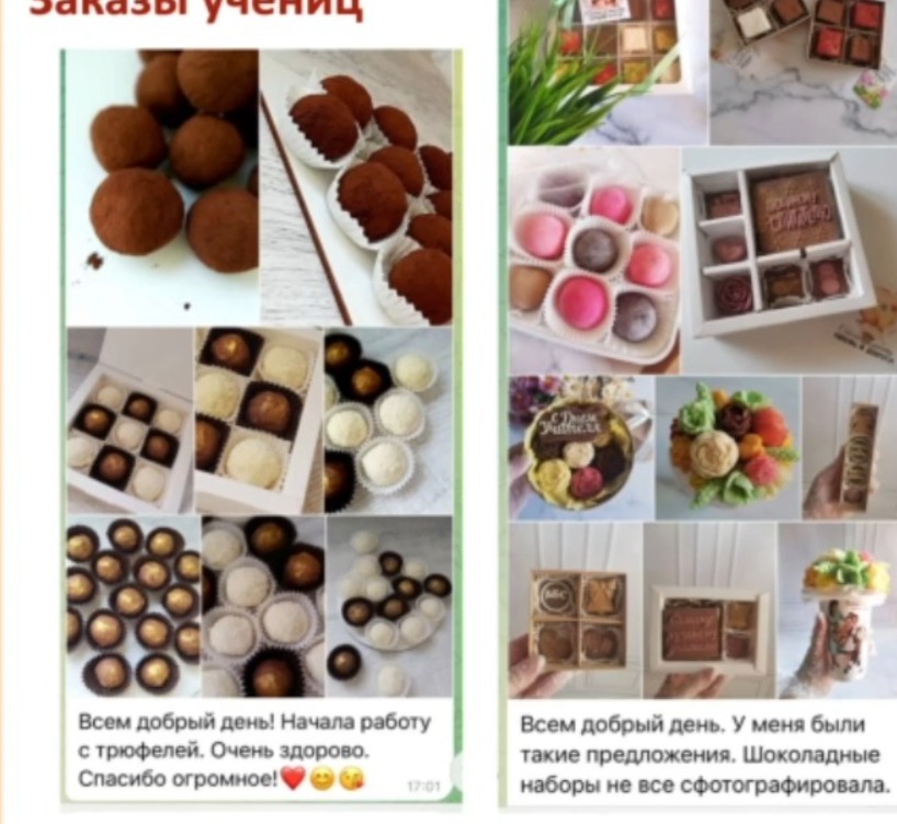 Тихий шёпот удовлетворения сквозь ширмы цветных страниц, где каждый шоколадный трюфель похож на небольшую планету в своей орбите сладости. Текст, будто нежная вуаль, рассказывает о путешествии в мир красоты и вкуса, где мастерство превращает обычные ингредиенты в произведения искусства. Это светлый ковер разнообразия: все оттенки шоколада, от тёмных до белоснежных, лежат рядом, будто говорящие о вкусовых градиентах в жизни. Работы учениц, как строки поэзии на вызолоченных коробочках, тянут за собой пленительное любопытство. Трюфели, яркие и задумчивые, как осенние листопады, вызывают желание исследовать всю палитру их вкусов. В каждом кадре, в каждом слове слышится радость открытия, приглашая в мир, где сладость — это история, а каждая коробка — это подарок от души.