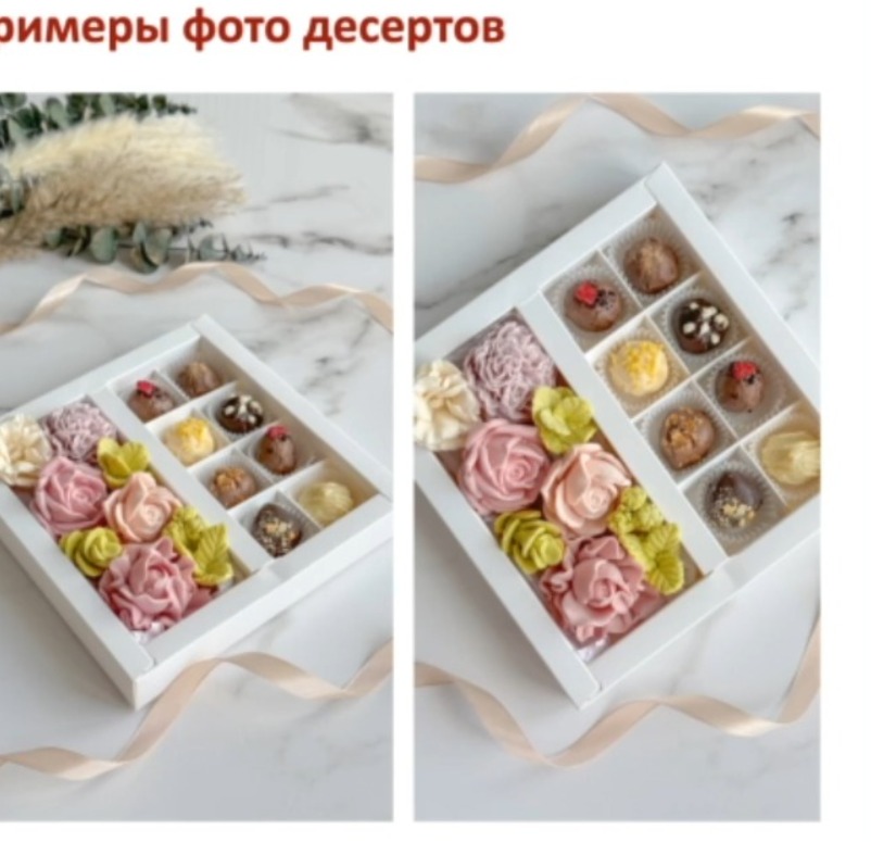 На белоснежной мраморной поверхности затаился изящный натюрморт, словно воплощение мечты о беспечно сладкой жизни. Перед нами — шкатулка, в которой лежат нежные розы, кутающиеся в пастельных тонах; розово-лимонные, чуть бежевые, безмолвно шепчущие о забытых теплом летнем закате. Их сопровождают ряды лакомств, серенадами сочными ягод и орехами, подобных гороху в жемчужных раковинах. Свет ложится сквозь прозрачные ленты, обвивающие шкатулку, будто скрывая тайну сладкой гармонии. Весьма вероятно, что здесь мы находим не просто набор десертов, а метафору удовольствия, прячущуюся за нежными красками, согревающими сердце. Букет сухоцветов в уголке завораживает, его тени подчеркивают романтичный танец светотени. Вместе, они строят хрупкий мост между реальностью и сном, который может существовать только в этом запечатленном кадре. Это мягкая музыка утонченности в каждом штрихе, нежность, которую можно почти почувствовать на кончиках пальцев.
