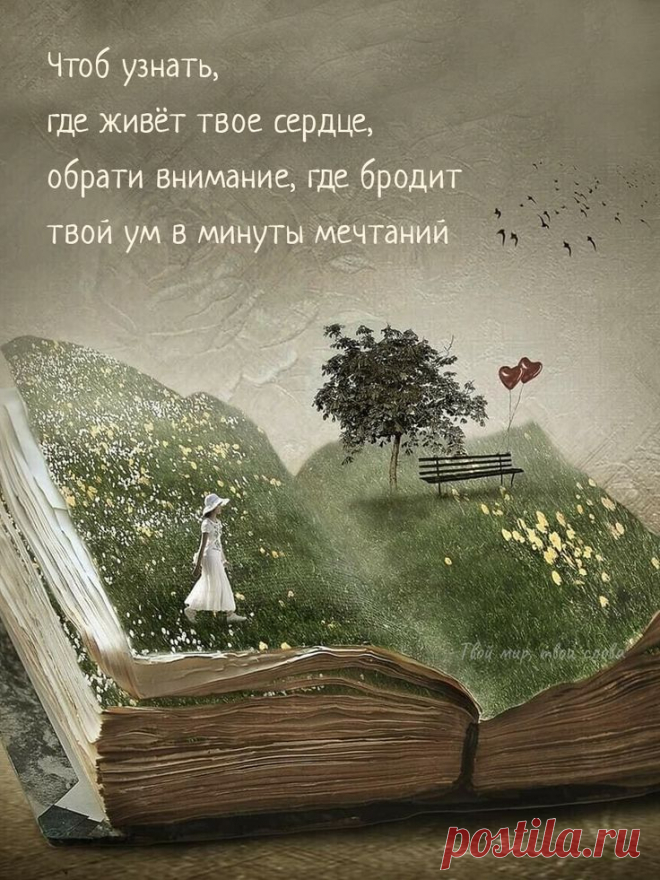 Под покровом вечной тишины лежит огромная книга, её страницы раскрылись, словно зовя в путешествие. На истёртых склонах страниц расцветает поле, осыпанное бусинками одуванчиков, которое живёт само по себе — так, как воображает только тот, чьё сердце скрыто в этих строках. Одинокая фигура в белом платье, уносимая лёгким ветром мечты, бродит среди зелёных холмов и думает о дальних мирах, где каждый шаг — это новая глава жизни. Корни дерева вплетаются в текстуру страниц, смешивая реальность и сказку, а в воздухе летают воздушные шарики, словно мечты, так и не тронувшиеся с места. Послание на фоне, выполненное шрифтом лёгким, как дыхание весны, подсказывает — важное скрыто не в буквальном смысле, а в умении мечтать среди обыденного. Тени слов создают эхо в памяти, где звуки превращаются в образы, картины — в рассказы. Здесь осознание приходит с рассветом и уходит на закате, оставляя следы на страницах жизни.
