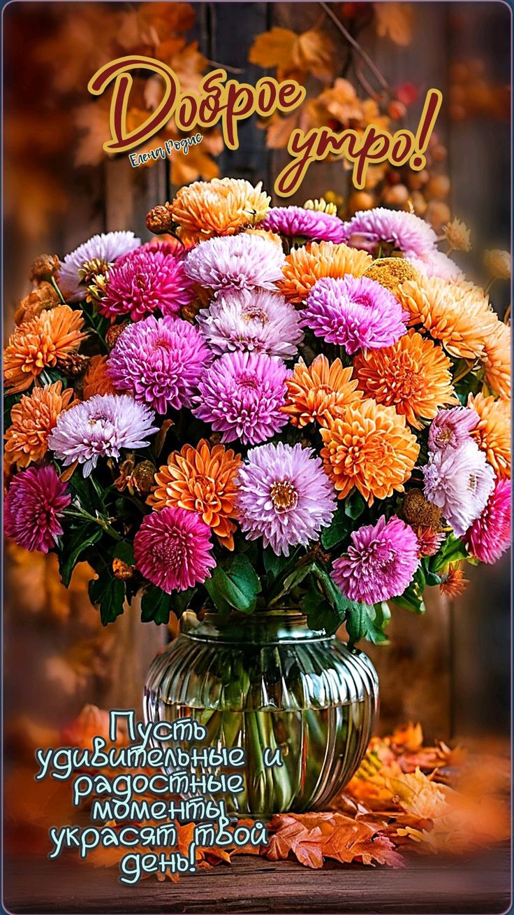 Эта сцена — словно свежая нота начала дня, где каждый цветок в хрустально чистой вазе рассказывает свою историю. Оранжевые и розовые хризантемы, подобно всполохам рассвета, украшают своим сиянием раскидистый букет. В его хаотичной симфонии форм и красок чувствуется ритм природы, стремящейся воссоединить нас с утраченными мгновениями радости. Ветер играет с осенними листьями, роняющими печально-золотые танцы на столе. Надпись, как легкий шепот доброго пожелания, вкладывает свою мелодию в утреннюю песнь. Каждый день — новый лист, чистый и многообещающий, и в этом букете заключена их неоценимость. Дыхание природы скользит по световым тени, смещая акценты, внося в композицию оттенки утреннего света и призывного зова нового дня, подобного аккорду на скрипке.