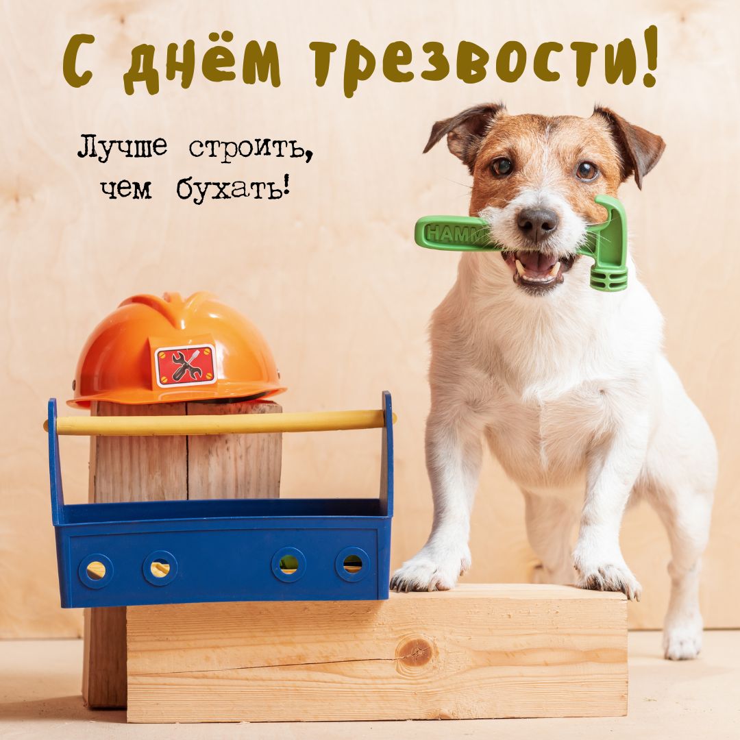 Под весёлым праздником мысли раскрывается сцена: собака, с серьёзностью театральной актрисы, держит в зубах зелёный пластиковый инструмент, который кажется одновременно и символом труда, и шуткой, скрывающей нежные оттенки иронии. Словно воплощённый альтер эго честного строителя, она пристраивается на деревянной подставке среди ярких оранжевых строительных касок и пластиковой коробки для инструментов. Слова «С днём трезвости!» выросли здесь словно лозунг, будто стремятся заменить шум кафе и клубов тихим шепотом рабочего квартала, где под лунным светом строятся мечты и новые высоты. Фраза «Лучше строить, чем бухать!» возникает как идея, переплетающаяся с индустриальными снами города, где каждый кирпич — это новая надежда на завтрашний день без тяжести вчерашнего падения. Свет играет тёплыми оттенками, отражаясь от пола словно утреннее солнце, обещающее преобразить все вокруг.