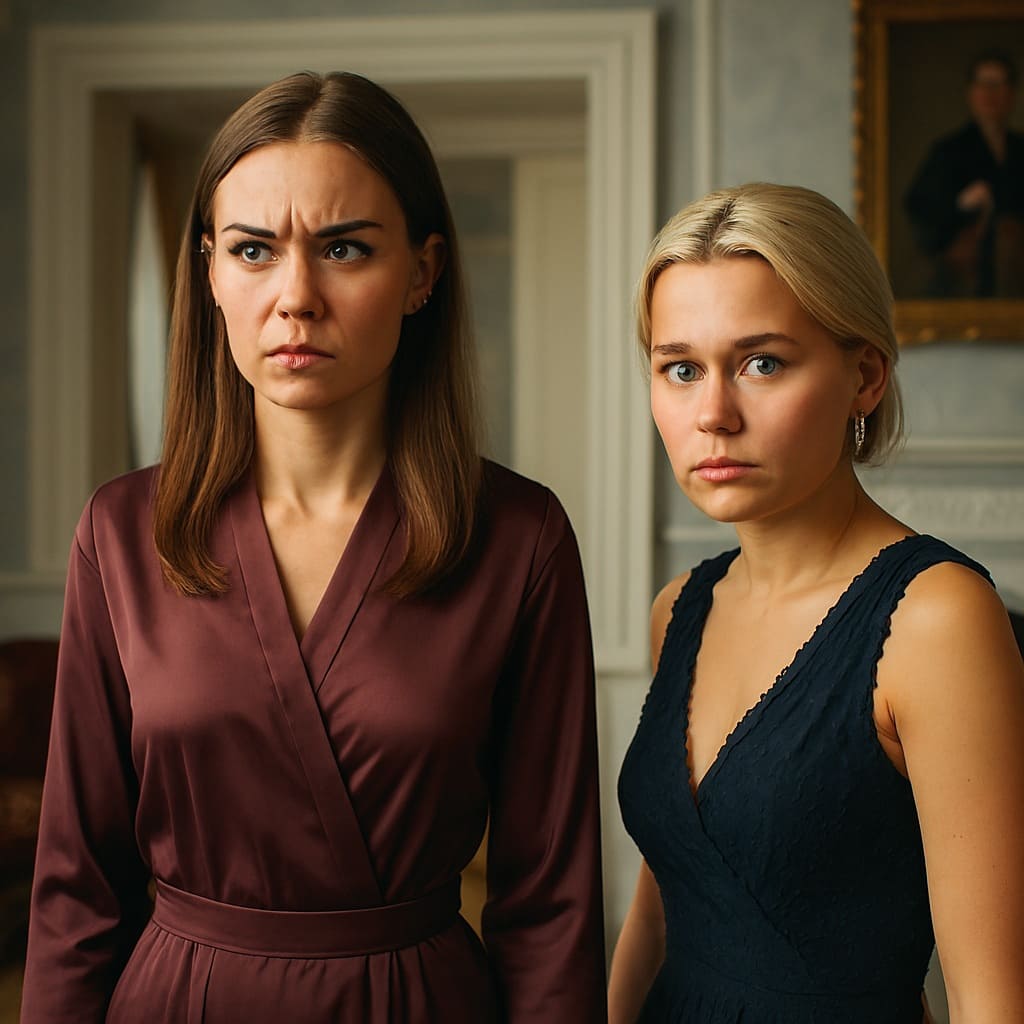 Величавые, будто два холма на фоне унылой панорамы, они воплощают в себе речь пространств, где каждая трещинка в стенах — как страницы старинного романа. Одна, в блестящем атласе бордовой ночи, словно хранителя тайн, другая, в изысканности темных волн, как нераспечатанное письмо судьбы. Их взгляды — это молчаливый диалог с судьбой, в котором прошлое и будущее встречаются в нерешительности настоящего. Потолок, высокий и невозмутимый, резко контрастирует с быстротечностью человеческой жизни, храня в себе гул вечности. Комната, обрамленная рамками портретов, кажется забытой галереей, где сам Время плетёт свои невидимые нити. В миге их тихой сосредоточенности слышится эхо — голос между страхом и надеждой, который резонирует с каждым, кто тихо ступает в эту комнату.