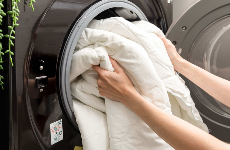 Мягкий свет дня наполняет комнату, где бледные руки осторожно погружают сверкающее белизной одеяло в пасть стиральной машины, как если бы это был ритуал очищения, символизирующий надежду на свежесть нового начала. Гладкая поверхность техники сияет, отражая зелёные листья на заднем плане, словно подчеркивающие естественную гармонию, которая так необходима в городской суете. Вместо суетливого шума — тихий шорох ткани, как шёпот надежды на чистоту и порядок. Картинка оживает запахом озона и моющего средства, вокруг витает ощущение приближения домашнего уюта. За видимой простотой скрыто целое мироощущение, где ухоженность ткани символизирует порядок мыслей, а поддержание домашней среды — заботу о близких. Каждый вашестирущий круг — это миг осознания, что дом — это не только место, а состояние духа.