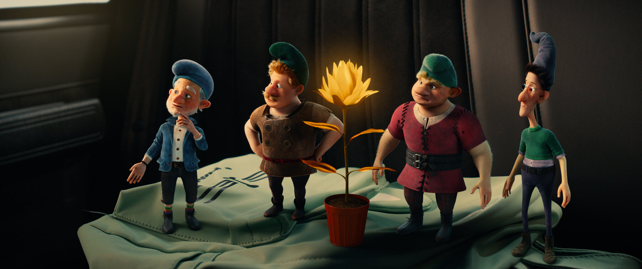 На старомодном покрывале дрожащего вагона собрались четыре фигуры, чьи лица увековечивают детские фантазии и мечты. Кажется, они ожившие иллюстрации из книги сказок, разыгравшие свой спектакль в свете одинокой лампы, с выражением мимолётной радости и лёгкой недоумённости. Их одежда словно из других времён, изобретённая воображением художников. В центре их собрания — загадочный цветок, добравшийся до небес в горшке, словно живой символ надежды и будущего. Он блестит золотыми лепестками, как утреннее солнце. Всё это — тихий голос капитальных века, когда рассказы уносили нас в далекие, ещё не изведанные миры. Этот кадр гармонирует теплом и уютом, каждый и в то же время все четверо вместе сливаются в контрастный ансамбль дружбы и удивления. Глаза героев смотрят на цветок, как на обещание новой, ещё не рассказанной истории, настырно прорастающей сквозь слои повседневности.