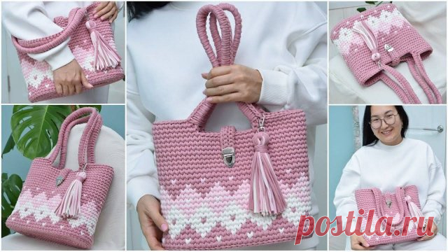 Сумка Тоут Бриллиант из трикотажной пряжи Вязание крючком Средний уровень сложности Видео Мастер-класс по вязанию сумки Тоут Бриллиант из трикотажной пряжи. Размер сумки высота 27 см, ширина 33 см. Материалы для сумки: 1. Трикотажная пряжа ALTYN основной цвет (пепел розы) 2 мотка цвет номер 2 (молочный) 0,5 мотка; цвет номер 3 (зефир) 0,5 мотка; в целом мотке 100 метров, 300-350 гр