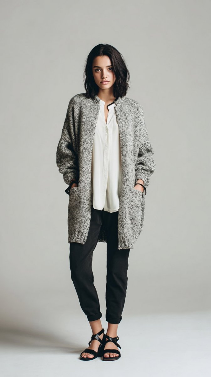 Среди тихого потока времени, как героиня ненаписанного романа, она стоит, уверенно и в удивительном равновесии между простотой и элегантностью. Серый кардиган обнимает её плечи, как теплый друг, даруя чувство безопасности в мире, где мода — лишь отражение внутреннего мира. Белая рубашка — символ чистоты и открытости, её сверкающая поверхность мягко преломляет свет, окутывая её мягким сиянием. Она в брюках, которые каким-то образом превращают каждое движение в маленький танец. Пальцы босоножек уверенно касаются земли, соединяя её с городской жизнью, полной шепота и историй. На фоне всего этого мерцает тихий шёпот надписей, как будто крик тихой улицы, где реальность переплетается с мечтой.