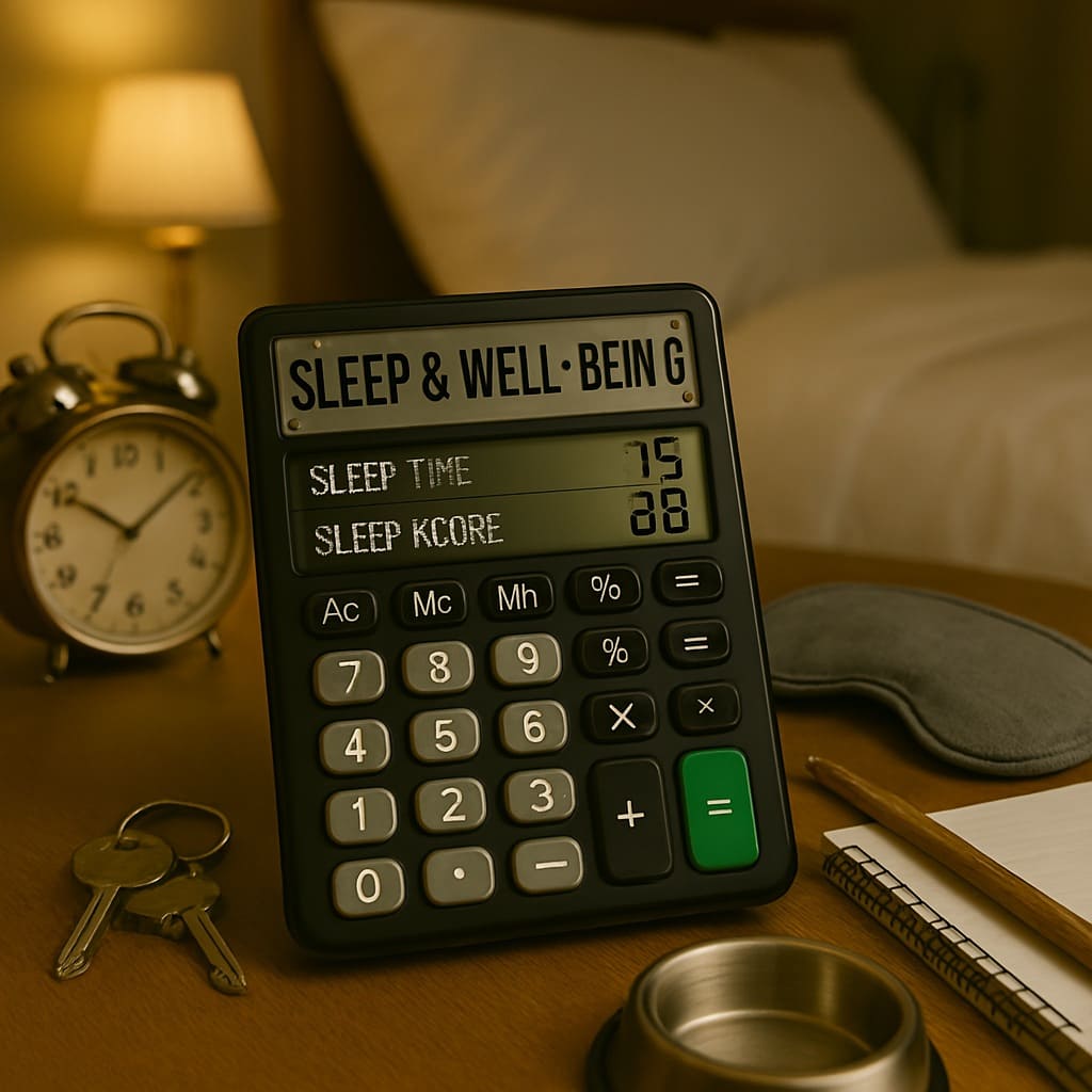 В мире, где каждая минута сна бесценна, на деревянном прикроватном столике лежит странное устройство - калькулятор сна, словно пришедший из научно-фантастических историй. Его экран холодно светится в полумраке комнаты, отражая приглушённый свет лампы, трогая подсознание подобно мягкой мелодии. На табло отображается загадочная статистика: "SLEEP TIME" и "SLEEP KCORE", как будто подсчитывающие саму сущность ночных грёз, превращая их в сухие цифры. Рядом покоится записная книжка с карандашом, застывший в том самом моменте, когда ещё возможно зафиксировать увиденный сон. Будильник, казалось бы, сговорился с калькулятором, заговорщицки отсчитывая время к пробуждению. Мир звуков и форм наполняет воздух, заставляя задуматься о смысле сна в быстром танце дневных забот, где каждая секунда ночи имеет вес золота. Эта сцена, подобно тихой симфонии, уводит мысли в мир, где сон - роскошь, недоступная без цифрового замера.