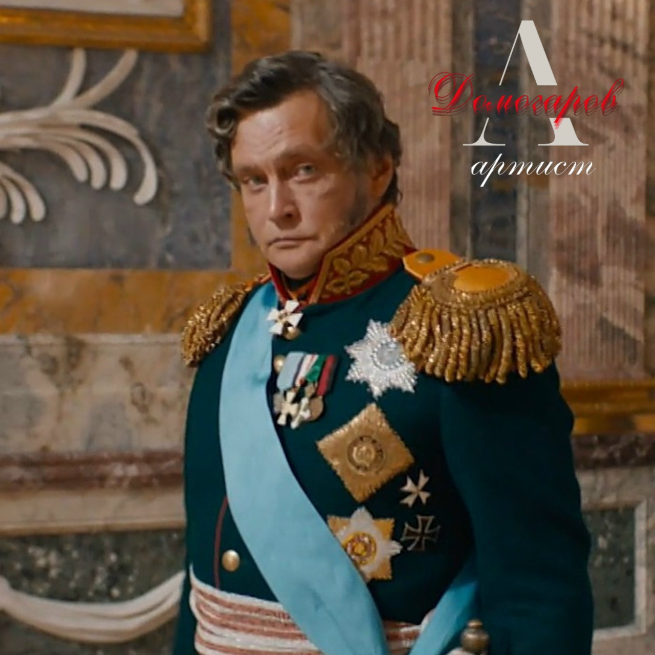 Фигура человека, словно вырезанная из старинной карты, застывает в центре сцены, окружённая роскошью прошлого. Его мундир с блестящими эполетами и звёздами рассказывает истории о славе и высоких чинах. Кажется, именно здесь, среди колонн и барельефов, стены когда-то впитывали величие прошлых столетий, словно древние скрижали. Лёгкая усмешка на лице героя — намёк на то, что судьба и история постоянно играют в свои сложные игры. Подпись, как тихий шёпот, напоминает нам о роли искусства и ремесла в этой сложной декорации, о том, что каждое движение, каждая деталь — часть великого спектакля жизни. В этом взгляде скрыты ответы на вопросы, которые мы, возможно, уже никогда не зададим.