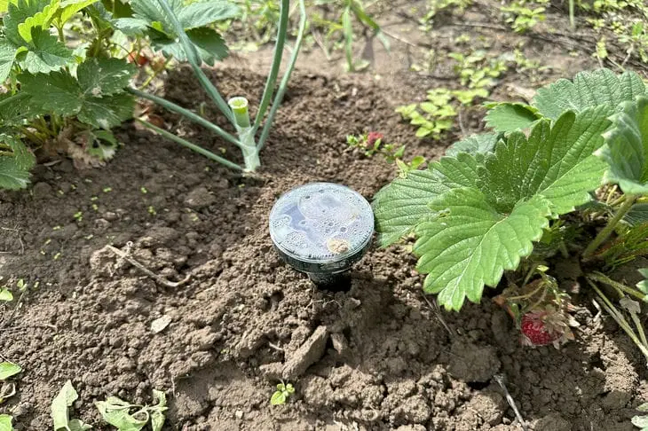Это изображение, словно из дневника тайного наблюдателя, запечатлело нежный танец природы и технологии. Земля дышит, тёплая и влажная, как будто напитана тысячелетними историями. Маленькое устройство на фоне текстурного горизонта, едва заметное среди зелёного одеяла листьев, кажется стражем современности среди просторов прошлого. Листья клубники тянутся к небу, отражая свет, переливающийся на каплях утренней росы. Труды человека и влияния природы гармонично сливаются, создавая новый облик сада будущего, где каждое растение — это маленькая вселенная, ласково согретая заботой автоматизированного полива. В этой сцене смешивается тихий шёпот земли и вкрадчивая песнь технологий, будто страница ненаписанной книги, рассказывающей о мирах, где цифровое и естественное соединяются в мирном предвкушении плодородного лета. За кадром слышится легкий ветерок, который шепчет секреты садовникам.