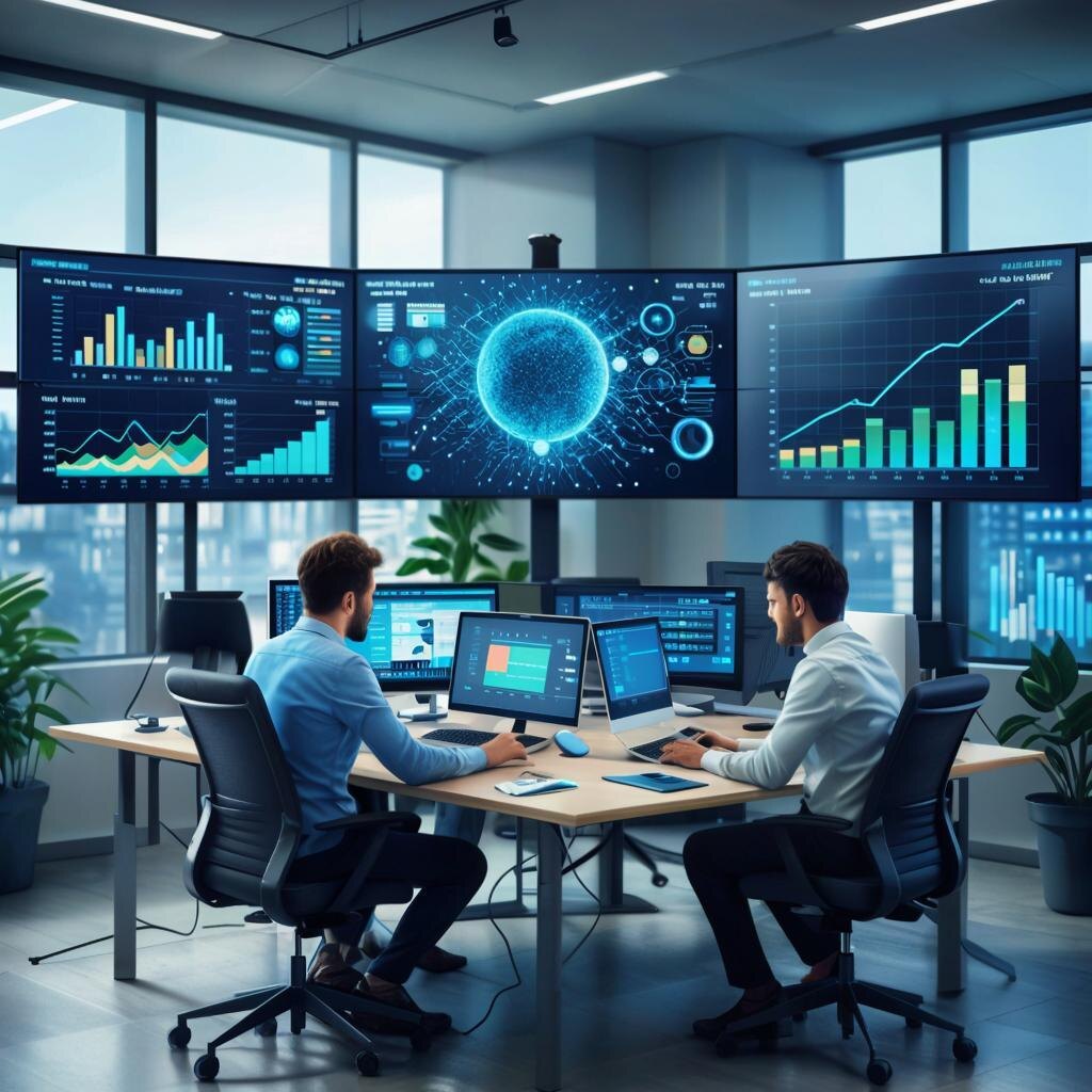 В этой современной техно-симфонии офис наполняется звуками электронного шёпота. Герои нашего времени, словно два капитана космического корабля в галактическом путешествии данных, сидят перед мерцающими мониторами, на которых разворачивается целая вселенная графиков и аналитики. Мир, где прибыль и убытки сотканы в один узор, похожий на звездное небо, где каждая цифра — это свет далекой звезды. Величественное представление цифр и линий на экранах напрягает невидимые струны их умов, вызывая метафорические вспышки озарений. За окнами стоит суматошный городской пейзаж, который, как фон, подчеркивает их сосредоточенность и отстраненность. Взгляд каждого загадан в будущее, где технология управляет танцем человеческой мысли.
