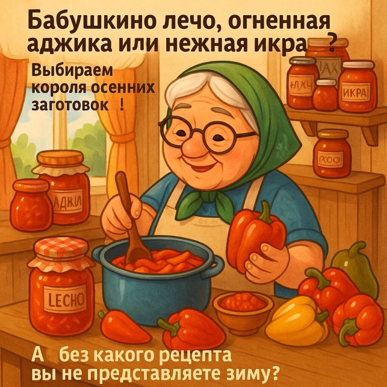 Тёплый свет раннего осеннего солнца мягко ложится на подоконник скромной кухни, где бабушка с доброй улыбкой готовит краски золотой осени в банках. Её умелые руки, словно мастера кистей, создают кулинарные шедевры. Красный болгарский перец, словно рубины, ждёт своей очереди, чтобы стать частью уютного приветствия долгой зиме. Полки полны банок, где огненная аджика и нежная икра прячут летнюю палитру. "Выбираем короля осенних заготовок!" — негромко шепчет сама комната. Это — ритуал, передающий от поколения к поколению тёплую радость единения с природой. Смешиваясь с ароматами, воспоминания о весёлых летних днях окутывают помещение невидимой аурой, обещая согревать долгими зимними вечерами. Бабушкино лицо — зеркало её мудрости и любви, где каждая морщина хранит секреты заготовок, переданные от её матери. Она загадочно улыбается, зная, что без этих ароматов зима не будет столь уютной и щедрой на тепло вокруг камина.