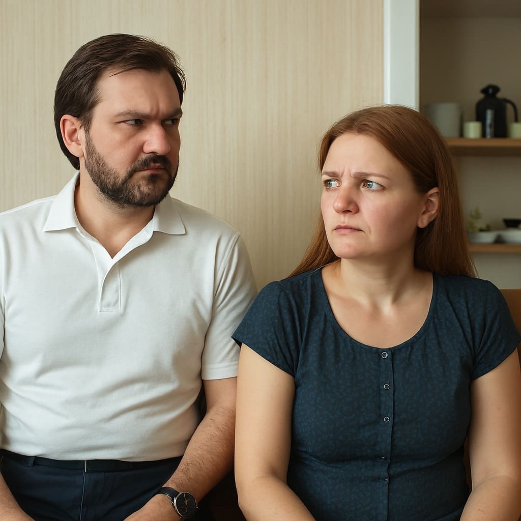 В их взглядах — невидимая буря слов и эмоций, словно молчаливая пьеса, разворачивающаяся на сцене повседневности. Он, в белой рубашке, будто пытается понять необъяснимое, как герой древнегреческой трагедии, решивший встать перед зеркалом судьбы. Она, украдкой взглянувшая в бок, подобна несмелой птице, почувствовавшей дуновение ветра перемен. Комната, на первый взгляд простая и обыденная, как палитра акварели, хранит многочисленные тайны этих стен. В тишине слышится лёгкий шорох — отзвук завершившейся ссоры или её начало. Подпись, как тенистая аллея, добавляет этому кадру оттенок рефлексии, уводя в глубины совместной истории, где каждый чувствует важность момента, затерявшегося в потоке времени и снова выплывшего перед глазами.