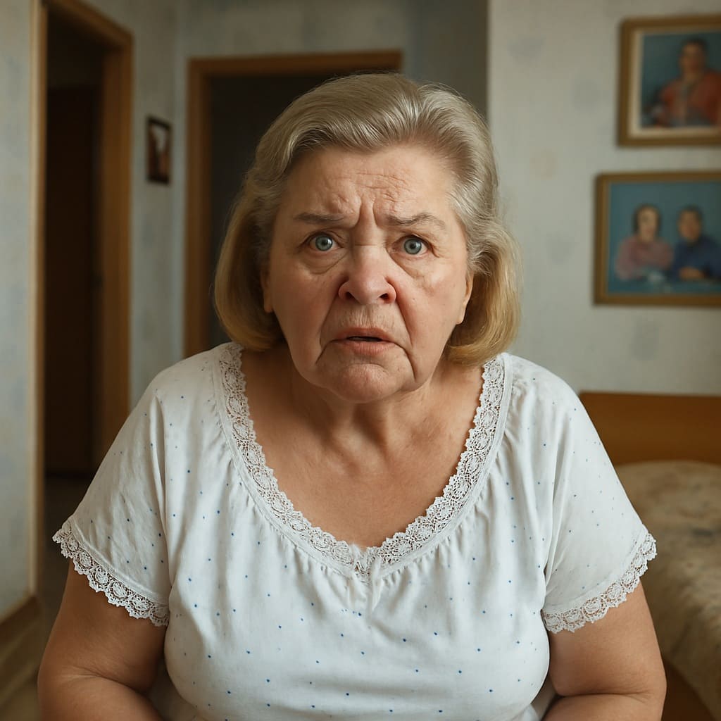 Комната дышит полуденной тишиной, и солнечные зайчики лениво скачут по старому фотоаппарату. Центральное место в этой сцене занимает женщина в возрасте, её лицо полно тревоги и непонимания. Глаза, подобно старинным зеркалам, хранят воспоминания и тайну каждой морщины. Этот взгляд проникает вглубь, в самую суть бытия. На заднем плане видно пару старинных семейных портретов — они словно стражи её ушедшей юности, бережно хранят её историю. На стенах едва заметные узоры обоев, как расширенные нервы пространства, слышат всё, что происходит. Это сцена — не просто мимолётный момент, это воплощённая память, тихая драма повседневности. В стуке часов слышится голос времени, повторяющий давние мечты и надежды, и шепот неведомых слов, как обрывки давно забытых разговоров.