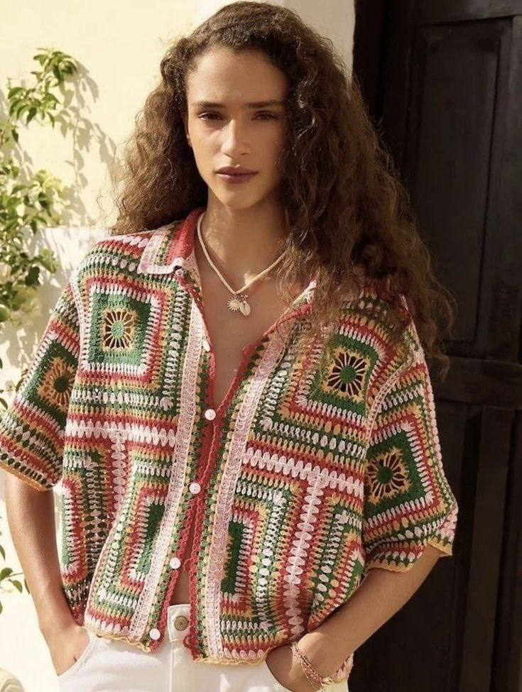 На тёплой террасе, под дружелюбным средиземноморским солнцем, стоит она — в картине, где каждый узелок вязания раскрывается как цветок весеннего сада. Её рубашка, сродни полотну импрессиониста, переливается дивным калейдоскопом цветочных узоров, пряча в себе секреты древних мастериц. Тени, ласково пробирающиеся по её плечам, созданные плетением и светом, словно оживляют эти геометрические узоры. Лицо её смотрит в объектив с задумчивой задумкой о вечном. Цепочка с амулетом — как тихий оберег, шепчущий истории о будущих странствиях. Ветер приносит ароматы садов, где, кажется, холодные камни и выжженная земля лишь подчеркивают сочность зеленых листьев. Каждый стежок — это прикосновение рук и душ, объединенных в одно дыхание времени.