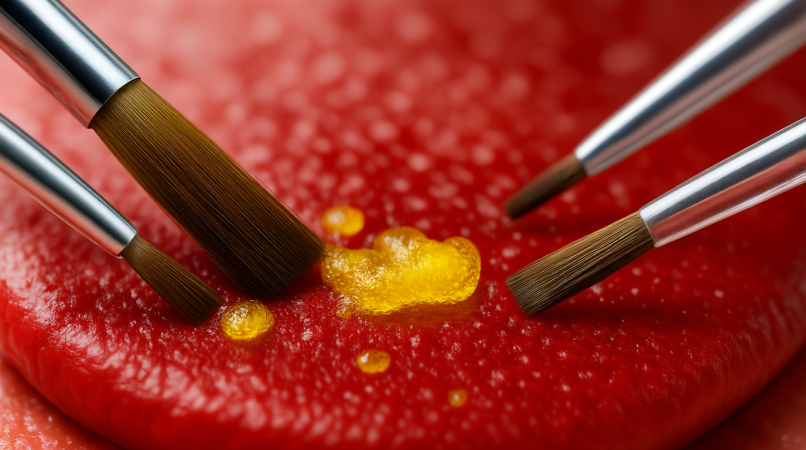 Под крошечными лучами света, словно под микроскопом художника-волшебника, раскрывается красочная композиция, где каждое прикосновение кисти мерцает как солнечные зайчики на холсте воображения. Красный бархат фона дышит теплом, в то время как капли золотого масла, словно магический эликсир, озаряют его поверхность. Каждая кисть, как отдельный герой, танцует и вырисовывает собственную мелодию, создавая картину, полную деталей и чувств, что перетекают друг в друга с плавностью акварельных красок. Этот момент — это встреча искусства и эксперимента, где постила.ру, как загадочный голос за кадром, шепчет через время и пространство: "Смелее, творите, позвольте цветам говорить за вас". Это приглашение к диалогу между реальностью и мечтой, где искусство становится мостом к неизведанному, дарящим зрителю мгновение радости и созидания.