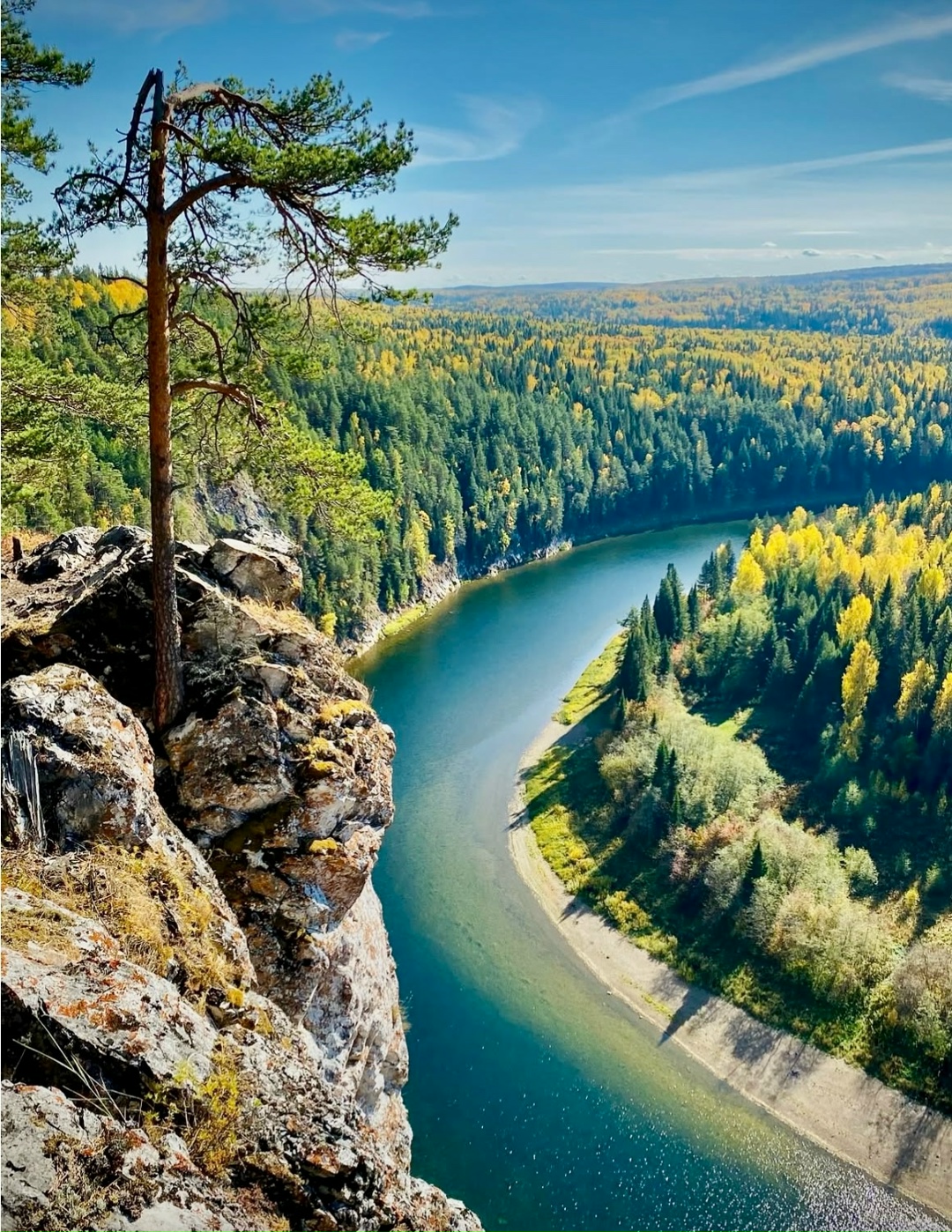 Скала, словно древний страж, опирается на мудрый ствол одинокого дерева, вырастающего из каменной груди, устремляя свой взгляд к реке, извивающейся внизу, как серебристая лента прошлого. В лесном ковре, сотканном из оттенков зелени и осени, пробиваются золотистые лучи заходящего солнца, освещая бесконечную вилку горизонта, кажущегося невидимым в своей необъятности. Эта сцена наполняет сердце гармонией и тихой радостью человеческого существования, напоминает о незыблемости времени и вечности, пропитанной свежим ароматом хвои и земли. Тишина здесь полна истории, шепчущей о далеких странствиях, о мягких прикосновениях природы к сердцу. Горы удерживают небо, а река несет его отражение вдаль, унося с собой надежды и мечты.