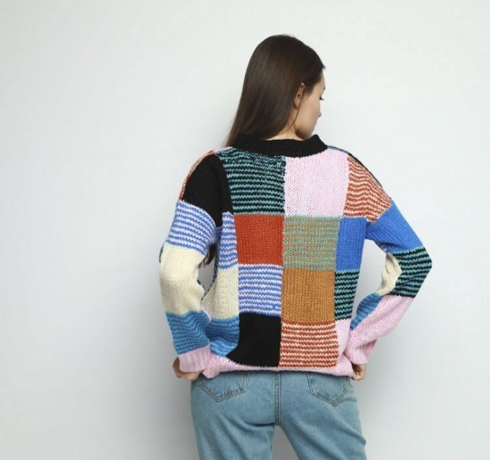 Кажется, что этот вязаный мир создавался как сказочный лоскутный ковер, где каждый квадрат — это новая история. Цвета, будто ожившие из детских снов, сплетаются в полотно странствий. Каждый шов связывает видимое и невидимое, искусно маскируя переходы от одной картины к другой. Девушка, стоящая спиной, словно не хочет прерывать магию мысли, держащейся на острие живописных узоров. Эта тихая музыкальная симфония текстур вызывает теплое чувство домашнего уюта и предлагает погрузиться в мир беззаботного творчества и воображения, где осенний вечер может обернуться многослойной романтической мелодией. Таков этот свитер — вещь, притворяющаяся обыкновенной, но на самом деле обладающая магией преломления привычных вещей в сказку.