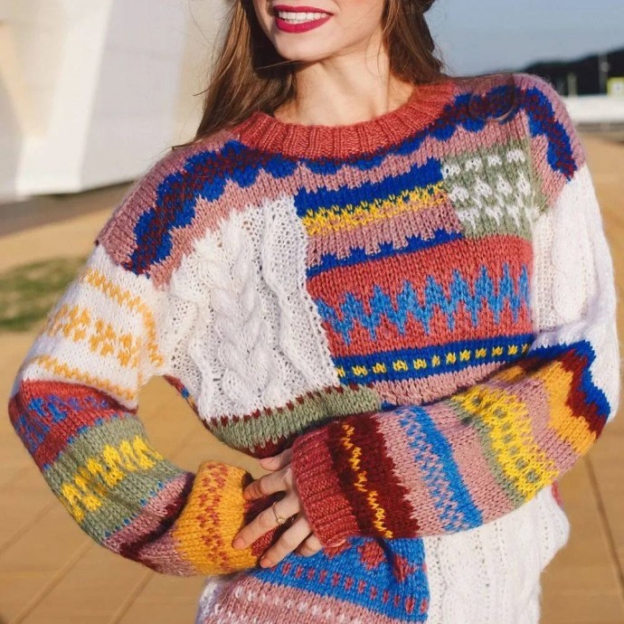 На берегу утреннего света, она стоит, завернувшись в яркий кокон из сотканных воспоминаний, словно сама природа создала этот свитер из оставшихся нитей солнца и ветра. Каждая петля – часть истории, начертанная на радуге времен. Смешение красок и текстур напоминает игру летающего ковра из детских сказок. Её улыбка – как солнечный зайчик, переливающийся сквозь цветные окна витража, ведёт за собой, будто в танце. Рукава, как реки, струящиеся потоками разноцветных эмоций, пересекаются и переплетаются, создавая замысловатый узор. Этот свитер – не просто одежда, но и одеяло для души, оберегающий от холода безразличных дней. Голос за кадром шепчет о пробуждении природы и людской надежды, будто бы это сам ветер рассказывает о том, как важно ощущать присутствие радуги в каждом прожитом дне, в каждом вдохе. Она – яркая нота в симфонии города, который просыпается вместе с ней.