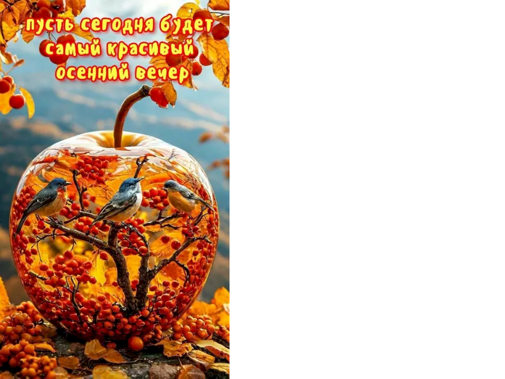 Смесь тепла и холодного рассвета воплощается в янтарном свете яблока, который стремится сказочно осветить раннюю осеннюю пору, драгоценно золотую и таинственную. На переднем плане, словно из тончайшего стекла, очерчена сцена причудливого мира, где ветви рябины обнимают маленьких птиц, с легкостью беседующих между листьев. Они щебечут, словно сказители, вещая историю о самом красивом вечере, обещанном закатом, согретым вдохновением. Шепот ветра пробегает сквозь эту волшебную художественную заморозку, раскачивая каждую деталь. Это время будто заключенное в янтарную капсулу воспоминаний, отголосок нечто человеческого и природного в единой мелодии. Краски сливаются, и оказываются в вечном плавании по горизонту, создавая неразрывную симфонию вечного тепла и простоты, длящейся лишь миг.