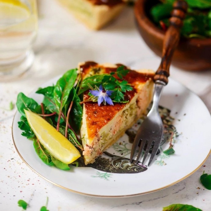 Этот гастрономический портрет, казалось бы, театрально высвечивает на фарфоровой сцене центрального блюда, больше напоминающего произведение искусства, чем простое кулинарное явление. Ломтик пирога, словно застывший в вечности, окружен изумрудными листами зелени, на которые будто упала звезда — синий цветок. Ленивый свет золотится на краях лимонного дольки, как напоминание о солнечных днях и средиземноморских бризах. Вилка, подобно магическому жезлу, украшает эту сцену, приглашая к тайному ритуалу дегустации. Словно в тишине загородного утра, на столе царит гармония простых вещей, отразившая то, что мир может быть теплым и притягательным. Здесь каждый оттенок и каждый штрих — это не просто элементы, а голоса, рассказывающие историю о радости, о времени, которое перестает быть суетливым, затихая в дружеских беседах и ароматах. В этой мелодии повседневности скрыта магия природы и таланта повара, который может превратить обыденное в возвышенное.