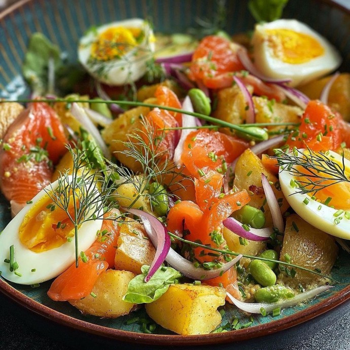 В это мгновение пёстрая симфония из свежести и вкусов оживает на фарфоровой сцене, где каждый ингредиент словно шепчет свою историю. Яркие полоски красной рыбы и золотистые дольки картофеля скользят по тарелке, как лучи солнца на морской воде. Между ними пробиваются желтки яиц с нежной, бархатной текстурой, словно обманывающие времени и наполняющие пространство светом. Фиолетовые полосы лука, тёмные контрасты кожи, дополняют картину, подобно нотам виолончели в сонате. Хрустящие мелкие зелёные горошины прячутся под сводами укропа, их тихая уверенность звучит на границе восприятия. Этот композиторский шедевр на тарелке — ода природности и гармонии, в которой каждой детали отведена своя значимая роль. Ощущение землистого вкуса картофеля и морской свежести рыбы создаёт полотно, перекликающееся с дуновением ветерка на скалистом берегу, где чайки парят в невесомости движения.