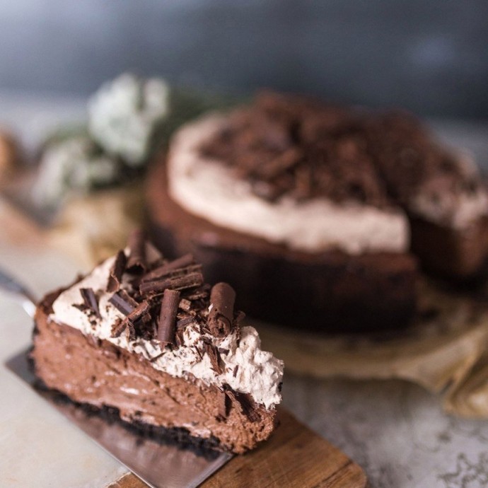 Рецепт шоколадного чизкейка Ингредиенты:Шоколадное печенье — 300 г Ганаш — 300 г Сливочное масло — 110 г Сливочный сыр — 680 г Сахарный песок — 210 г Какао-порошок — 105 г Сметана — 230 г Куриное яйцо — 4 шт. Жирные сливки —...