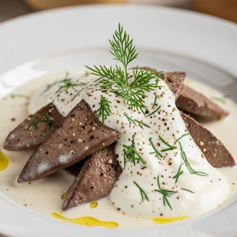 На белоснежной тарелке перед нами разворачивается гастрономическая симфония, где каждый элемент играет свою партию в гармонии вкусов и ароматов. Великолепие гладкой, кремовой консистенции соуса, словно молочный туман, окутывает коричневые ломтики печени. Черный перец, рассыпавшийся крошечными осколками звёздной пыли, добавляет остроты и загадочности, усиливая сливочную текстуру. Как парус пряного фрегата, веточка свежего укропа горделиво возвышается над всем блюдом, источая тонкий аромат лета. В уголках тарелки, словно отблески золотых лучей заходящего солнца, нежно переливаются капли масла, добавляя тепла и уюта этой кулинарной картине. В гастрономическом танце соединяются культуры и вкусы, создавая незабываемую атмосферу домашнего очага, где простота и изящество слились воедино.